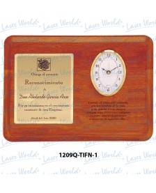 RECONOCIMIENTO DE ESCRITORIO Y TROFEO CON RELOJ EN MADERA MOD. 378 MEDIO PUNTO BASE RECTANGULAR. RELOJ QUARZO. IMPRESIÓN GRAVCOLOR. LAMINA GRAVOPLAY CORTE SEGÚN DISEÑO