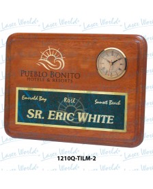 RECONOCIMIENTO DE ESCRITORIO Y TROFEO CON RELOJ EN MADERA MOD. 378 MEDIO PUNTO BASE RECTANGULAR, RELOJ QUARZO, LAMINA GRAVOPLAY IMPRESIÓN GRAVCOLOR CORTE SEGUN DISEÑO.