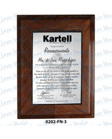 RECONOCIMIENTO DE PARED, MARCO MADERA ENSAMBLADO CON CRISTAL REFLEX. PERGAMINO LW ó CORTE DIAGONAL COMBINADO CON GRABADO LÁSER LÁMINA GRAVOPLAY CORTE SEGÚN DISEÑO Y PLACA FOTOGRABADO NEGRO. MINI LOGOTIPO LÁSER 3D.