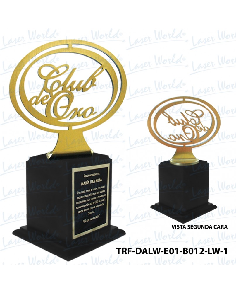 RECONOCIMIENTO TROFEO ACRÍLICO. CORTE CALADO SEGÚN DISEÑO, LÁMINA GRAVOPLAY DOS CARAS UNA CARA GRABADA. COMBINADO CON BASE B012, INCLUYE PLAQUITA LASER ALUMINIO NEGRA CON PLACA DE RESPALDO.